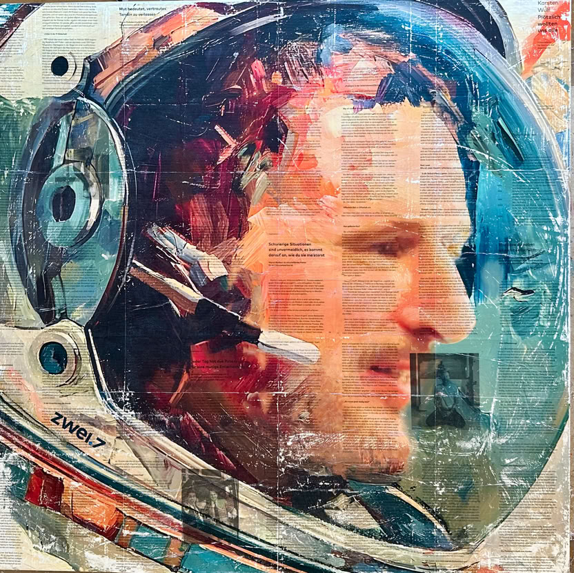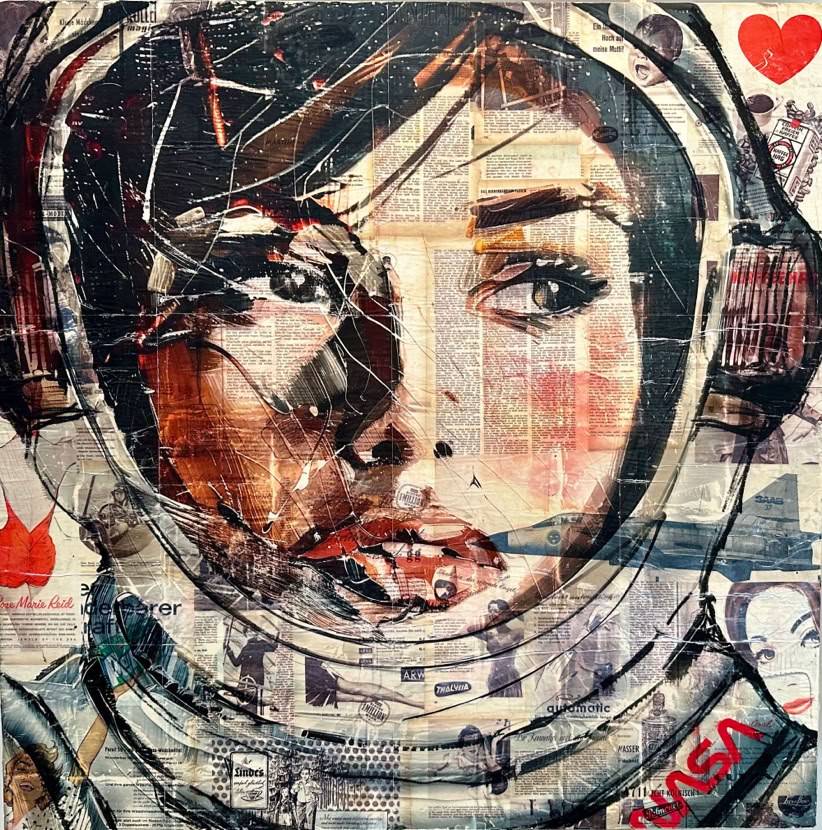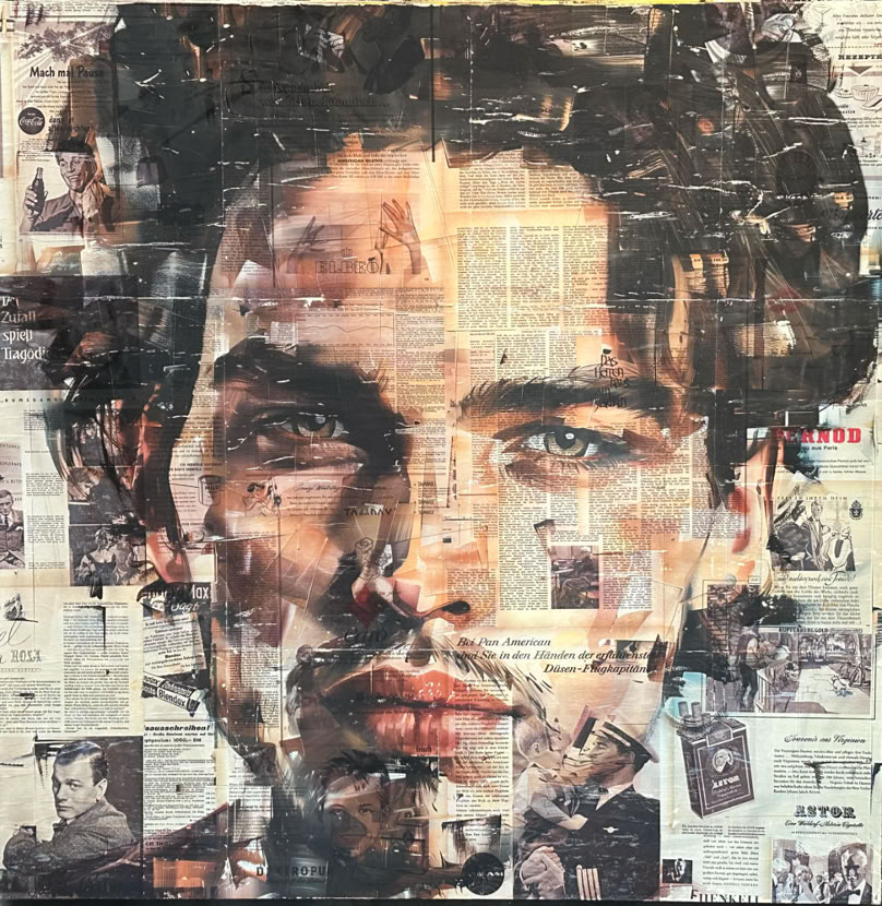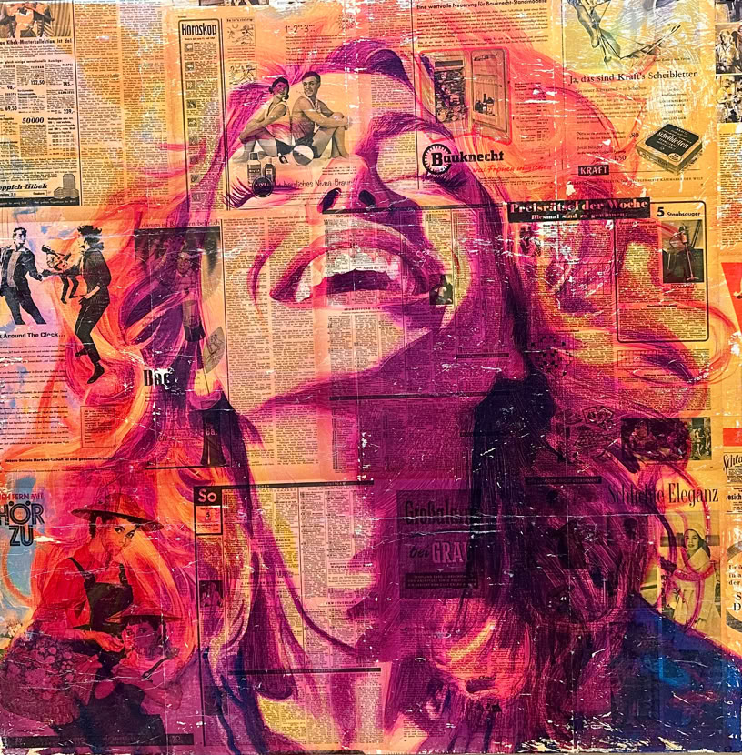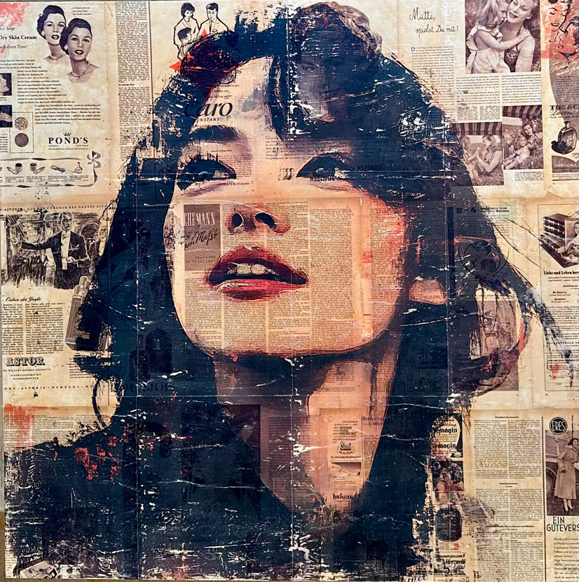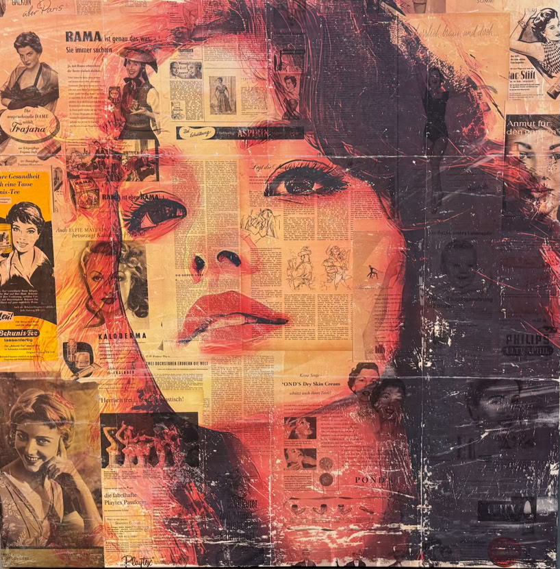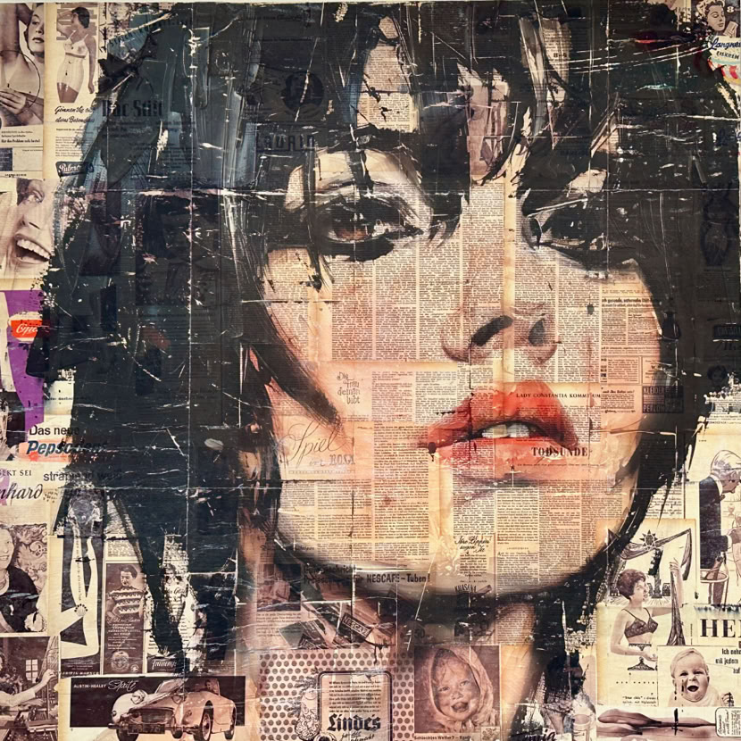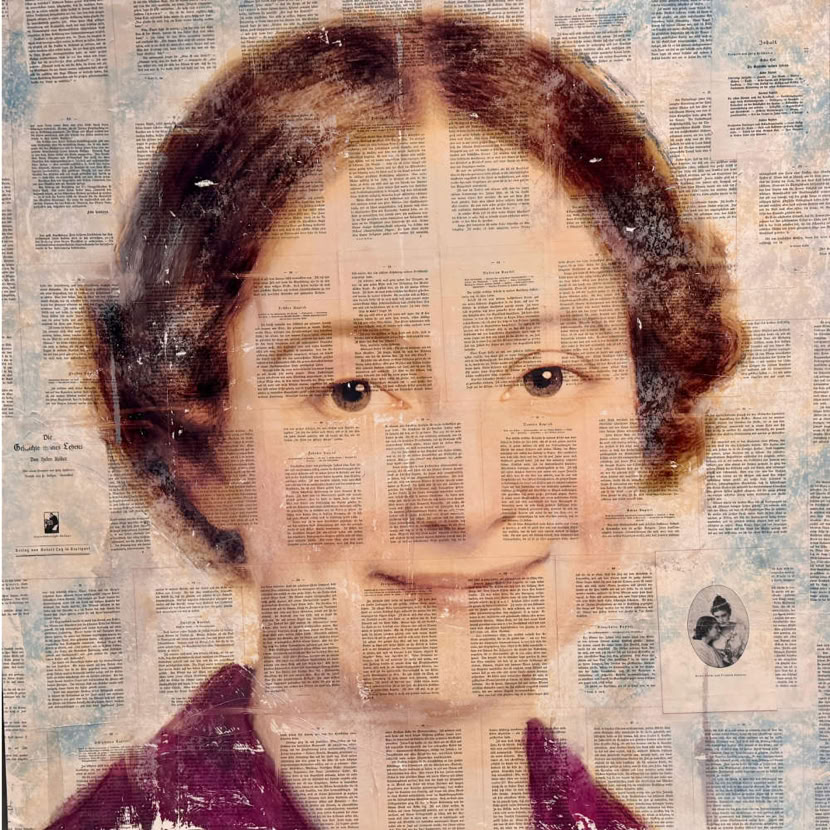 Ob Zeitschriften aus den 50ern, alte Buchseiten von 1900 oder handschriftliche Rezepturen – jeder Untergrund hat bereits ein Leben hinter sich und bekommt durch meine Kunst eine neue Bühne. Seit Ostern 2024 entstehen meine Portraits digital gezeichnet, auf altem oder neuem Papieren gedruckt und mit einer Handdrucktechnik weiterbearbeitet.