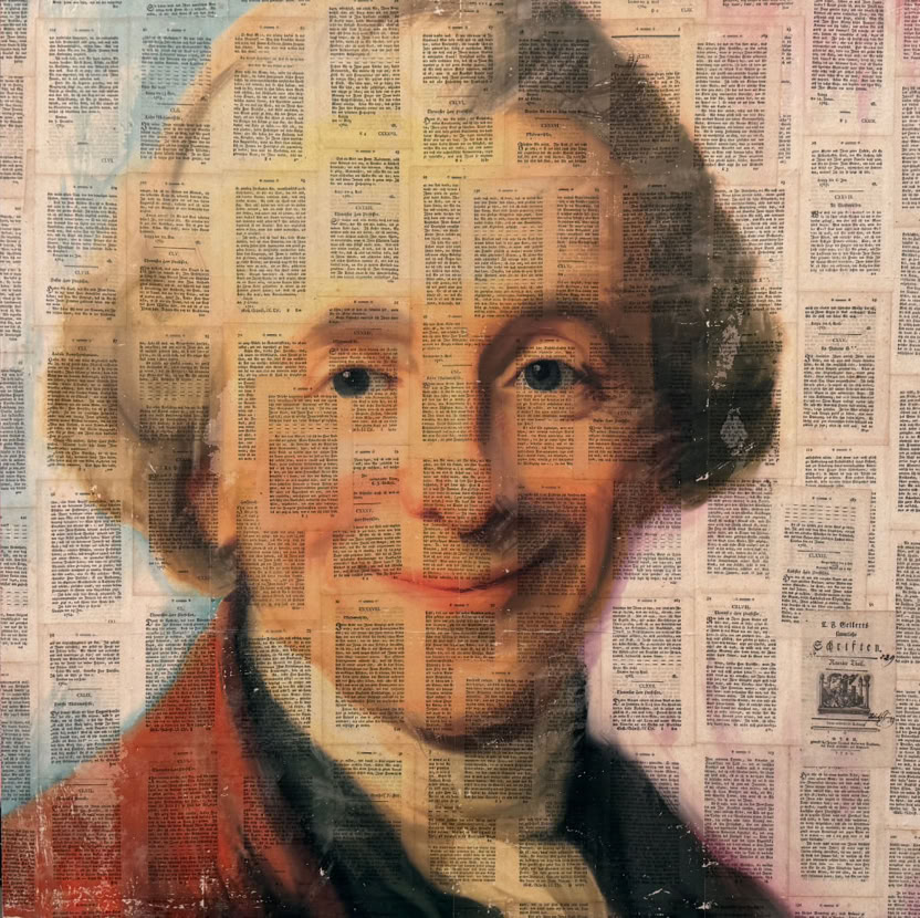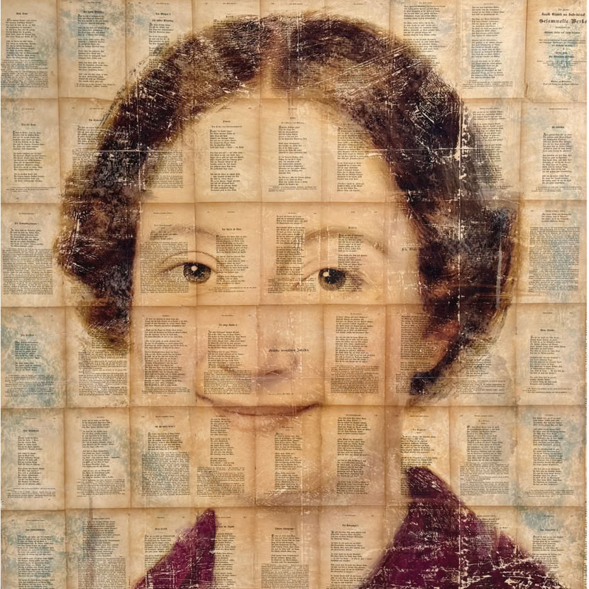 Portraits auf original Papier, teils über 100 Jahre alt, aus Büchern und Zeitungen mit einem transparenten Handdruckverfahren – so bleibt der Hintergrund immer sichtbar und erzählt seine eigene Geschichte.