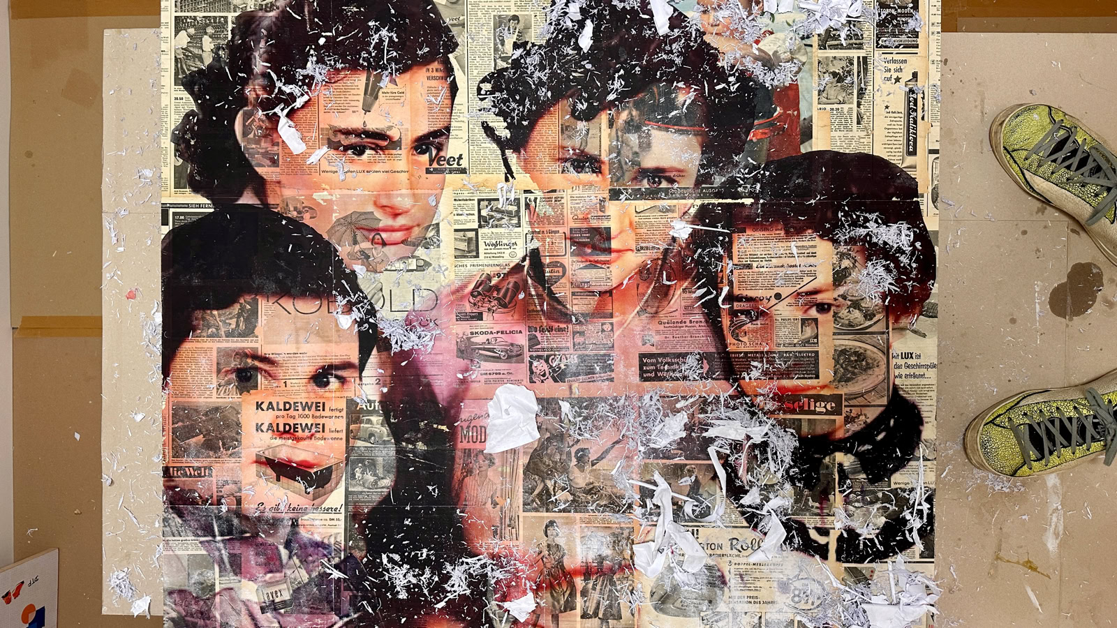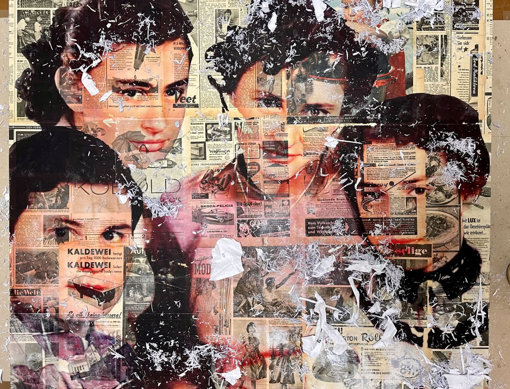 Hier habe ich wieder eine neue Technik erprobt, mit der ich sehr zufrieden bin. Auf einer alten HÖRZU Zeitschrift, größtenteils in SchwarzWeiß habe ich ein farbiges Bild transferiert und nachträglich koloriert. Was ich dabei jetzt endlich hinbekommen habe ist, dass viel Transparenz in dem Bild bestehen bleibt. Allerdings hat das auch den Nachteil, dass meine Tante Eka, (rechts unten) die Kaldewei Badewanne fast im Mund hat. Daran kann ich leider nichts ändern. Das ist Zufall. Das HÖRZU Coverbild ist in Farbe. Das werde ich zukünftig alles in ScharzWeiß machen, damit nur das transferierte Bild in Farbe besser wirken kann. Die Technik gefällt mit mir gut und ich werde sie zukünftig weiter verwenden. Auf dem Bild sind all meine Tanten zu sehen (von links nach rechts): Erika, Helga, Ruth (meine Mutter) und Inge.