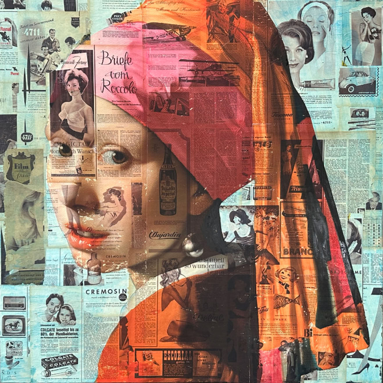 Hier mal ein Versuch mit einem alten Meisterbild Vermeer „Das Mädchen mit dem Perlenohrring“. Wir habe das Bild ganz unten als Gemälde von Künstler René Turrek. Das hat mich dazu inspiriert einen Versuch auf der Zeitschrift Film & Frau zu wagen. Ich finde es passt. Allerdings hätte ich bei der Beklemmung des Hintergrunds mehr auf die genaue Platzierung achten sollen. Jetzt ist eine BH-Werbung mit schwarzem Hintergrund mitten im Gesicht des Mädchens. Ist aber auch irgenwie witzig.