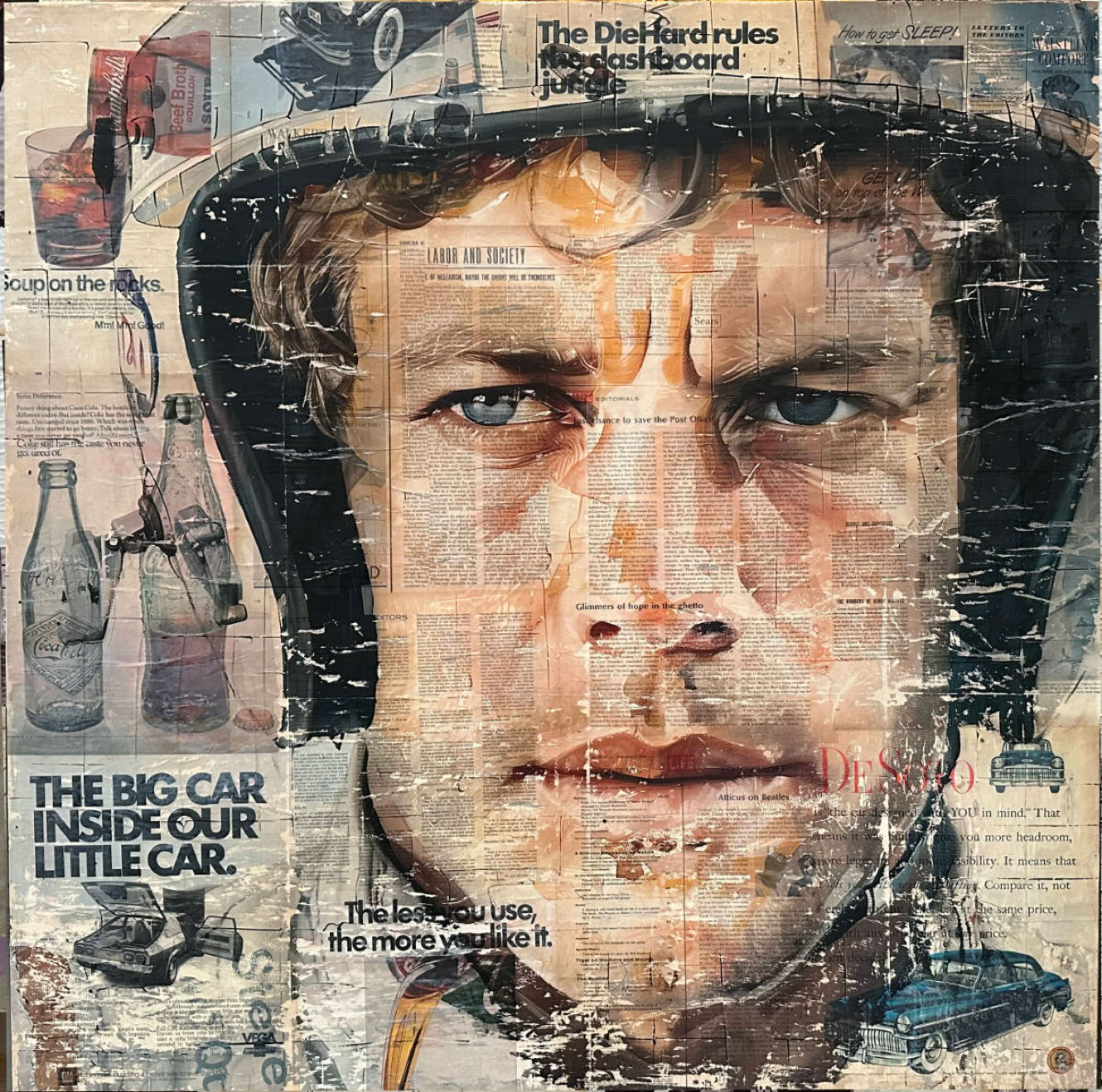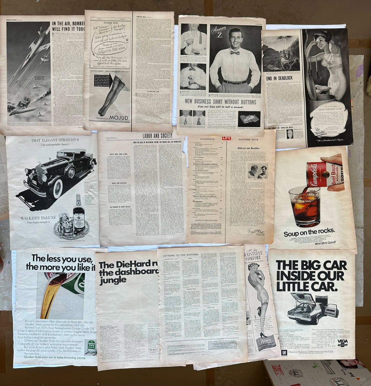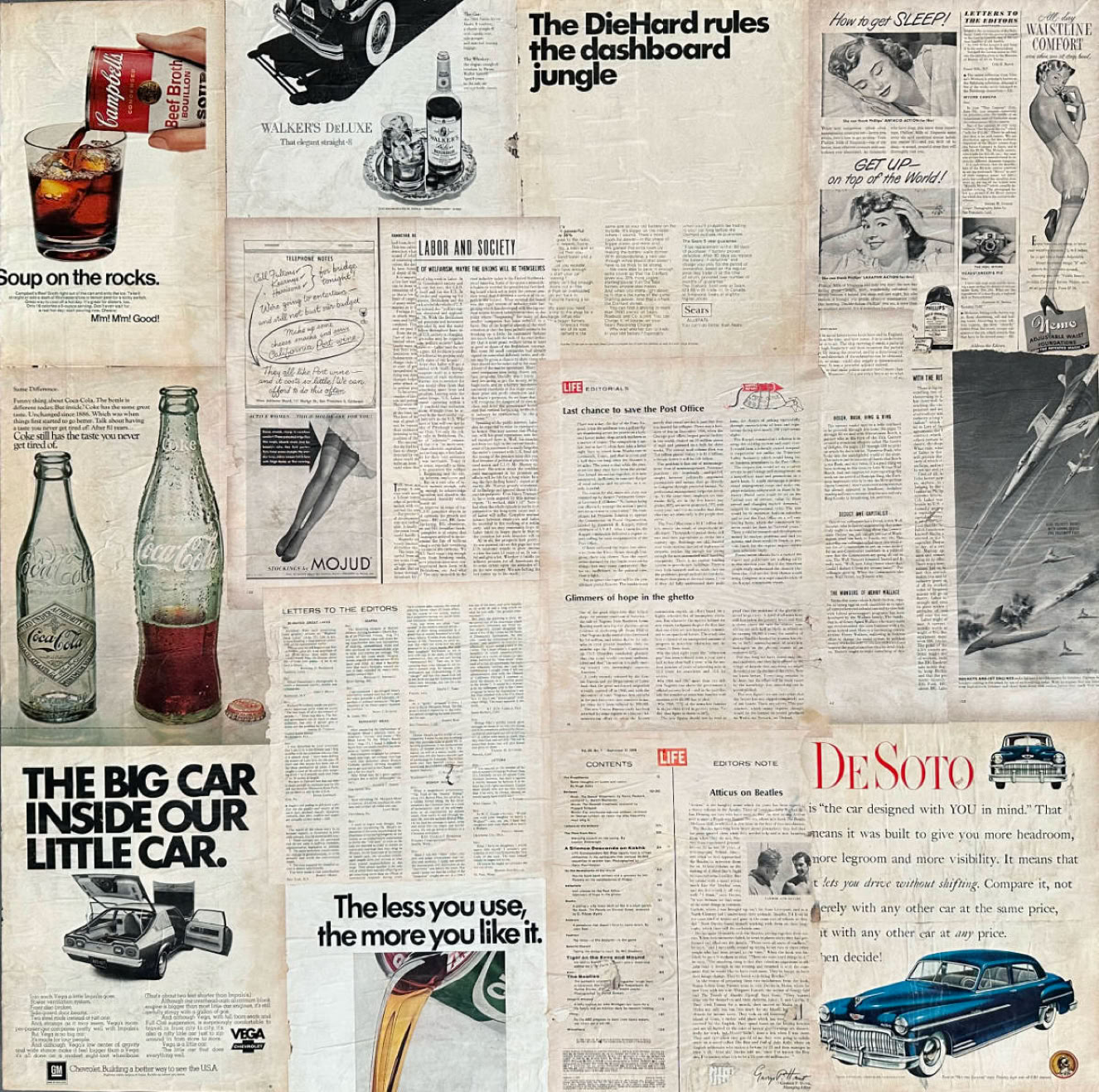 Jetzt mal ein ganz anderer Hintergrund. Diese TIME-Zeitschrift habe ich in einem Antiquitätenladen letztes Jahr in Brooklyn gefunden. Die Ausgabe ist von 1963 und recht gut erhalten. Da ich mich dieses mal für einen berühmte Person aus dem Motorsport entschieden habe, habe ich aus der TIME Zeitschrift hauptsächlich Seiten mit Werbung und Beiträgen über Autos, Motoröl usw. aber auch einer richtig alten Cola Cola Werbung ausgesucht.