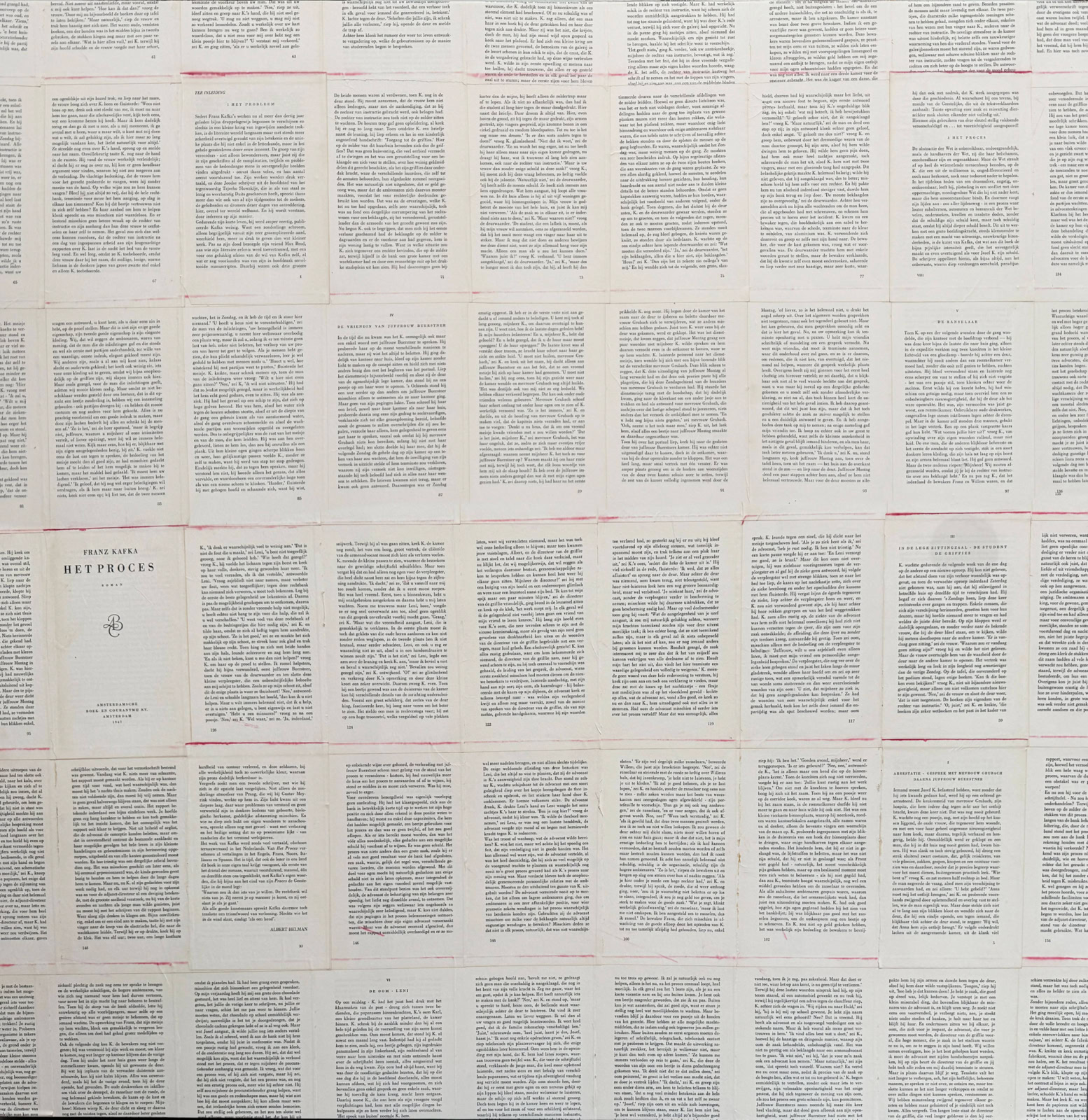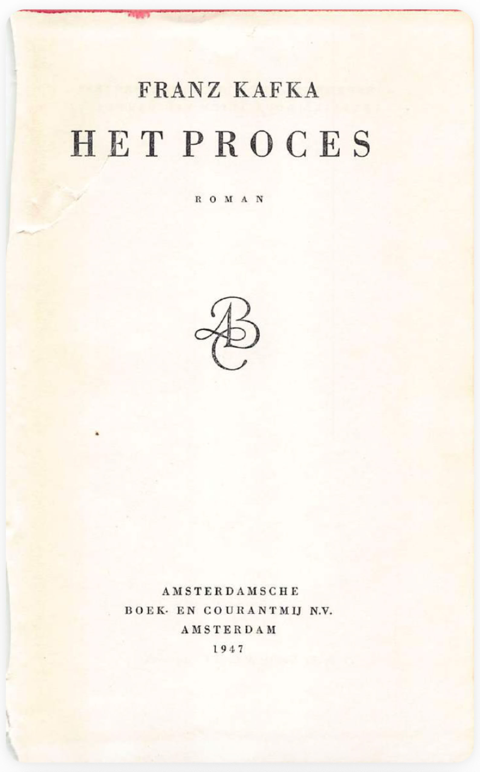 Als Untergrund konnte ich die niederländische Ausgabe von „Het Process“ von dem amsterdamer Antikbuchhändler Brinkman (Singel 319) kaufen. Das Buch stammt aus dem Jahr 1947 und wurde vom Verlag: AMSTERDAMSCHE BOEK EN COURANTMIJ N.V. veröffentlicht.