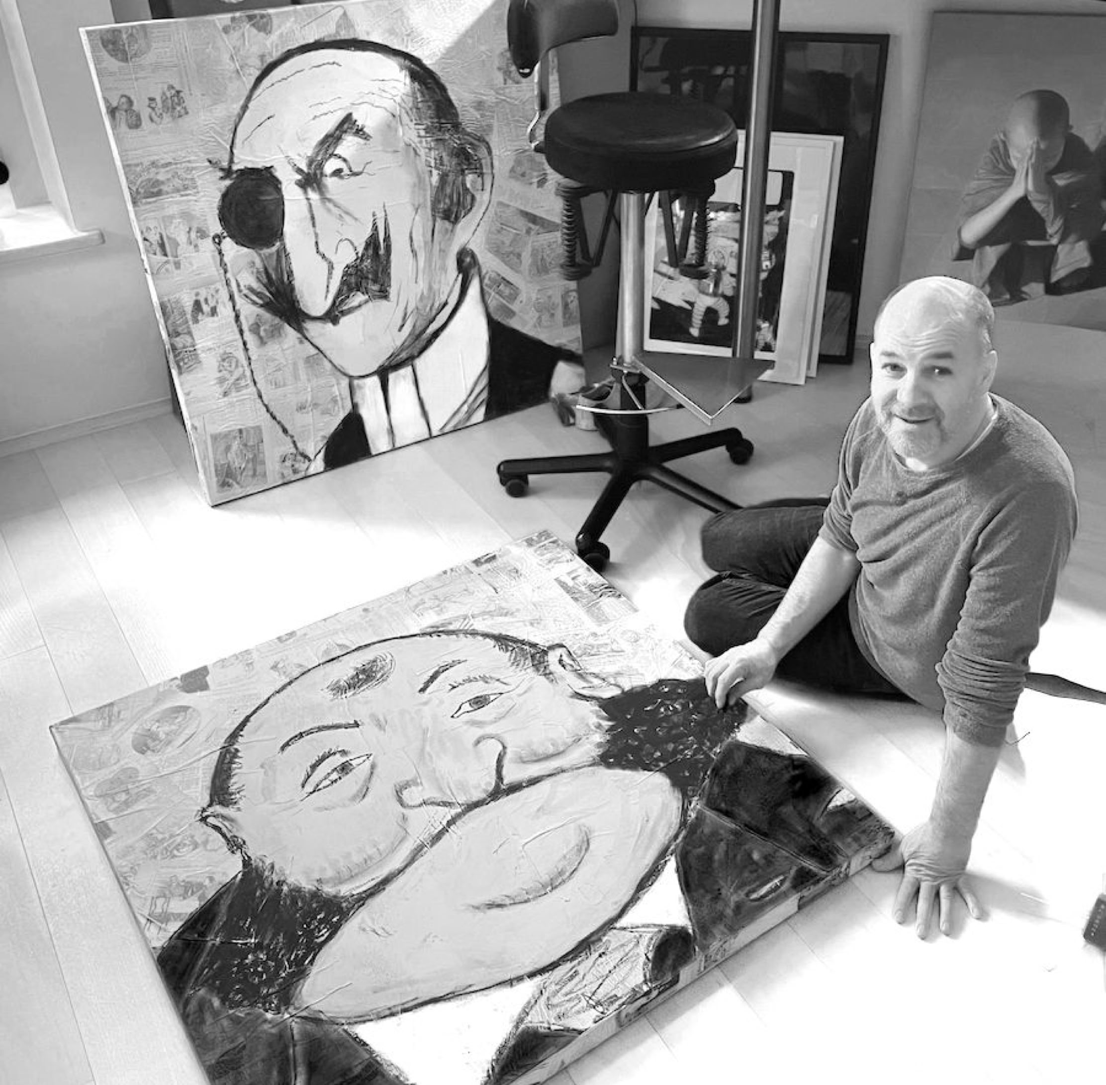 In der Coronazeit habe ich wieder begonnen zu malen – dieses Mal auf 1 x 1 Meter großen Bildern. Die ersten Werke entstanden mit Kreide auf alter Leinwand. Über die Zeit habe ich verschiedene Techniken ausprobiert und seit Ostern 2024, ab dem Bild 42, meinen Stil gefunden: Ich zeichne Portraits digital mit dem Stift und drucke diese anschließend mit einer speziell von mir weiterentwickelten Technik auf Leinwand. Dabei wird die Farbe Weiß in Transparenz umgewandelt, sodass der Untergrund stets Teil des Werks bleibt.