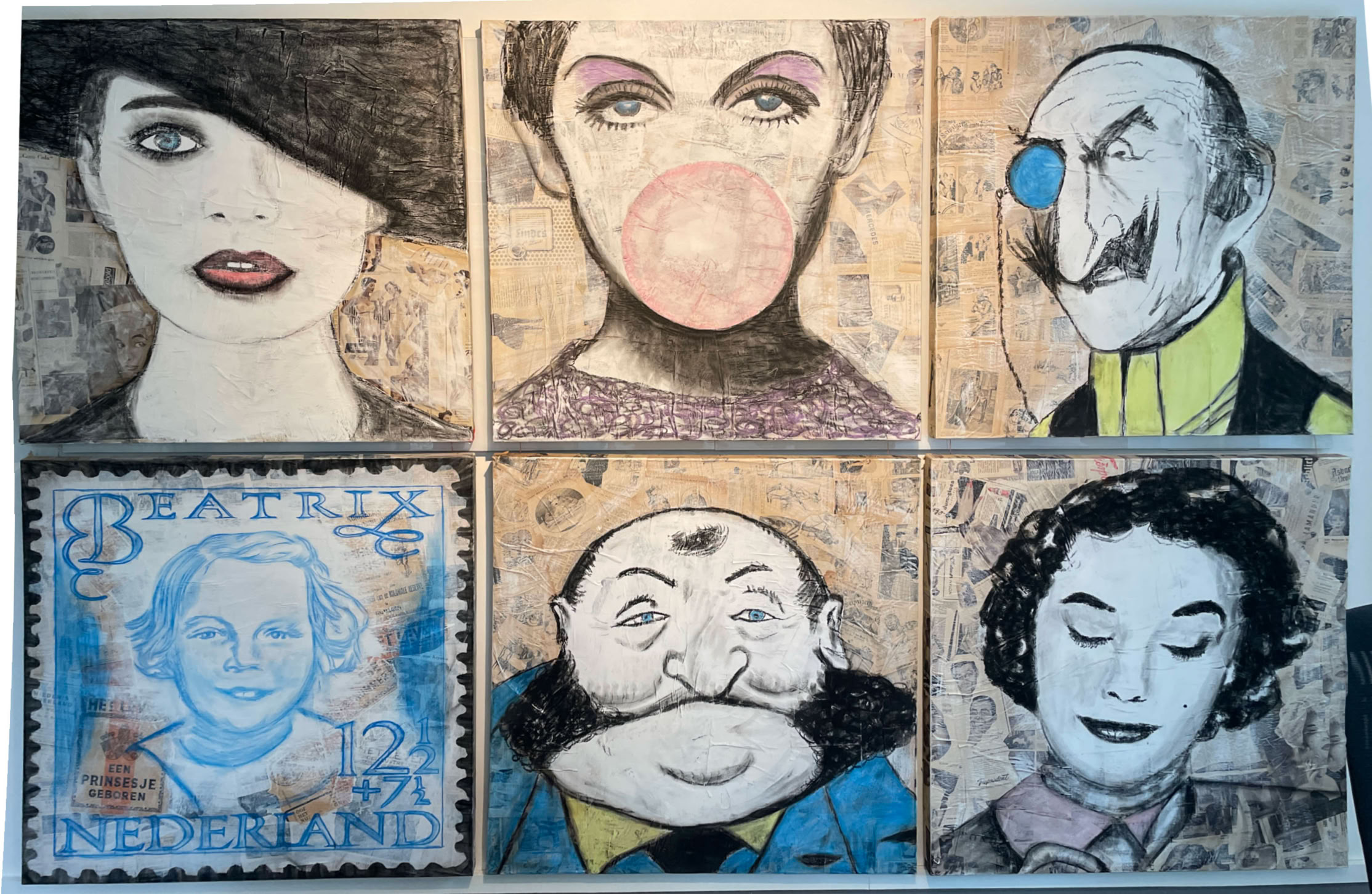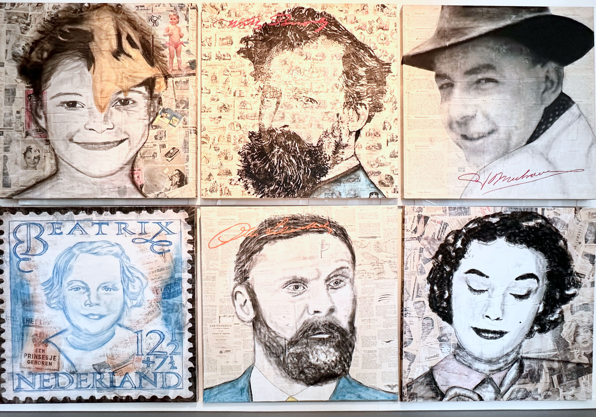 Die Druckvorlagen entstehen in einem spannenden Prozess, bei dem ich KI-gestützte Entwürfe mit handgezeichneten Elementen auf dem iPad kombiniere. Jedes Werk erzählt so nicht nur die Geschichte der abgebildeten Person, sondern auch die der Vergangenheit, die sich in den alten Zeitschriften und Büchern widerspiegelt. [Bert Mutsaers]