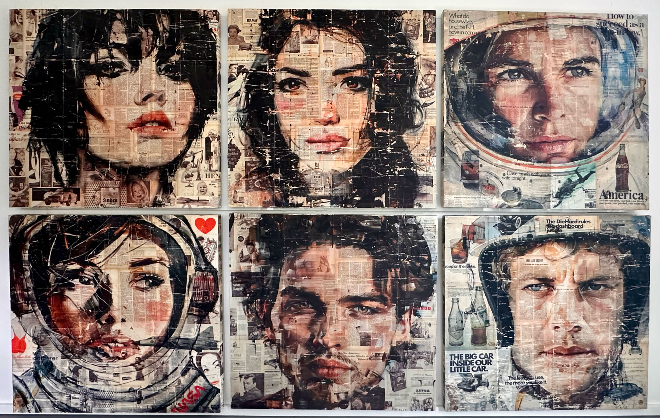 Als Untergrund dienen alte Zeitschriften oder Bücher aus den Jahren 1900 bis 1960. Die Motive stehen stets in Beziehung zu ihrem Untergrund. Für die Werke 08 „Buchhalter“ und 09 „Geschäftsmann“ habe ich beispielsweise Karikaturen aus Zeitungen von 1900 verwendet. Viele meiner Bilder basieren auf Ausgaben der Zeitschrift „Film & Frau“ aus den Jahren ab 1949.