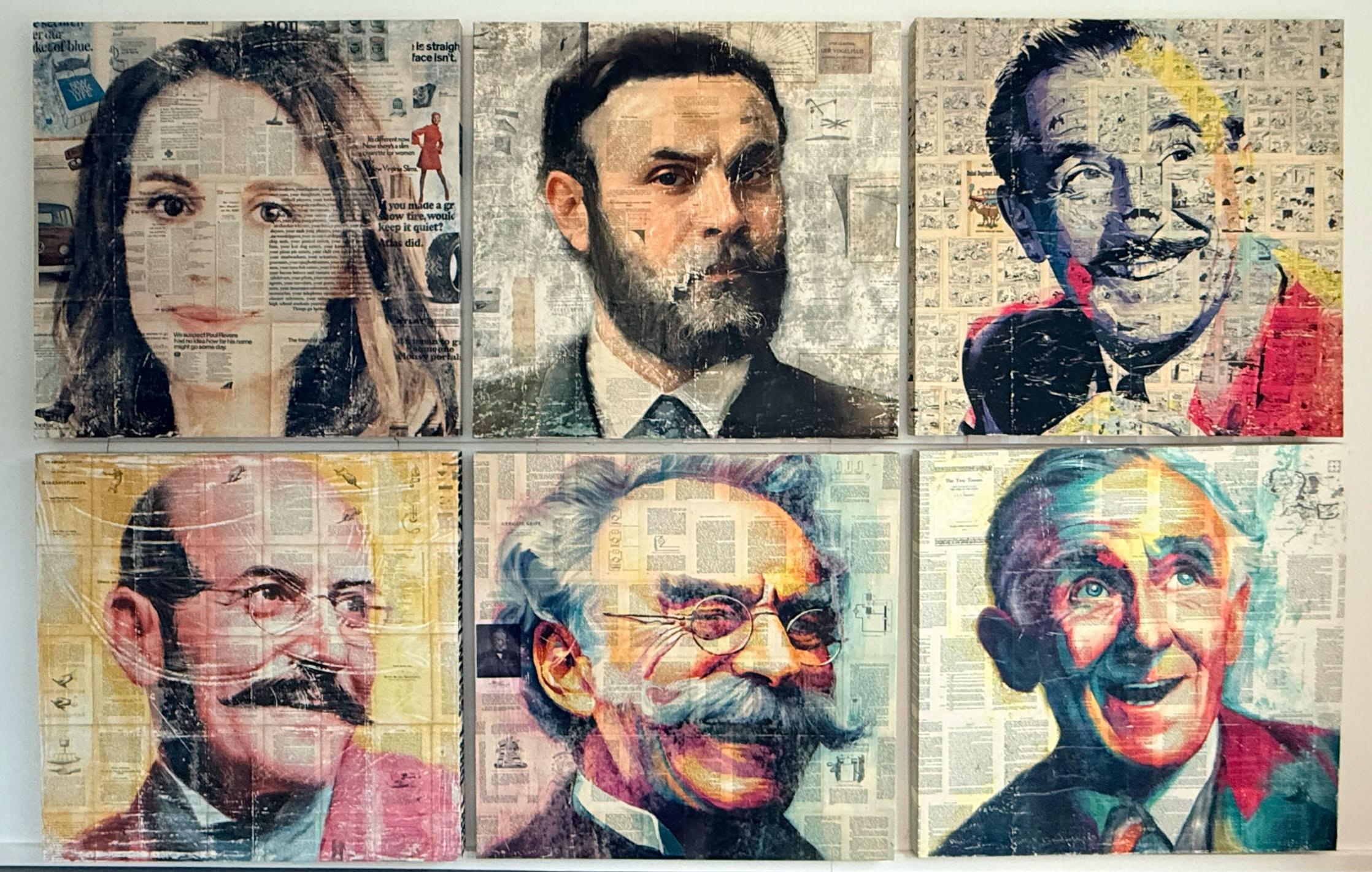 In der aktuellen Phase kommt eine dünne Holzplatte als Bildträger zum Einsatz. Sie ermöglicht einen präziseren Kunstdruck und eine neue technische Klarheit. Die Porträts werden digital vorbereitet, anschließend weiterbearbeitet und übermalt. Inhaltlich stehen prägende Persönlichkeiten im Fokus, die eine besondere Geschichte haben und zu denen ich einen besonderen, alten bzw. passenden Untergrund auftreiben konnte. Damit die Personen freundlich und lächelnd aussehen sind hunderte von KI-Pormpts generiert worden. Anschließend werden die Bilder mit einem Malstift digital nachbearbeitet bevor sie gedruckt werden.